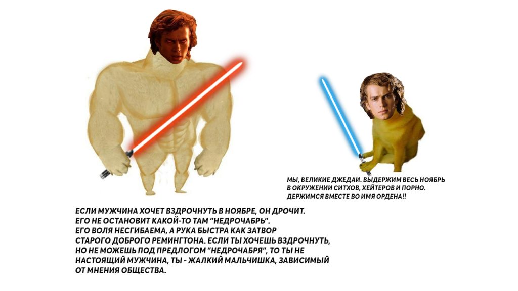 Студия «КТН», которая ранее выпустила какую-то мультипликационную «МадагаСрань» и злых птичек, решила переключиться на взрослое кино. Выбор авторов пал на «Месть ситхов» – можно констатировать, что мода переводить «Звёздные войны» полноценно вернулась. Версия от «КТН» вышла под вывеской «Дрочабрьские войны: Месть девственника» и ожидаемо представляет собой достаточно безблагодатное зрелище. Странно только, что релиз состоялся в ноябре. В дальнейших планах студии – сиквелы «Мгегаскара» и «Angry Balls».